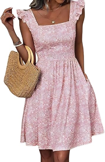 Women's Summer Dresses Casual Square Neck Floral Sundress with Pockets A Line Flowy Beach Dress