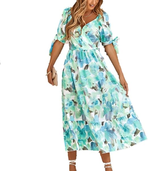 Summer Floral Short Sleeve Midi Dress Women's V Neck Boho Floral Flowy Smocked Dress Ladies Casual Boho Floral Maxi Dress